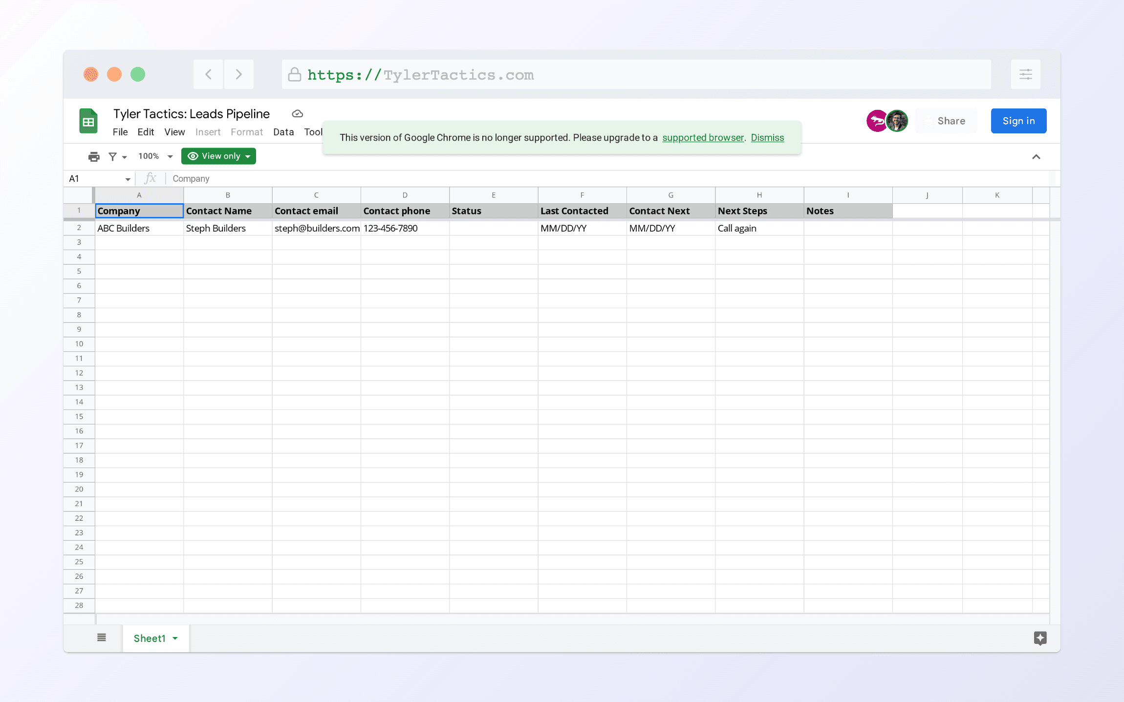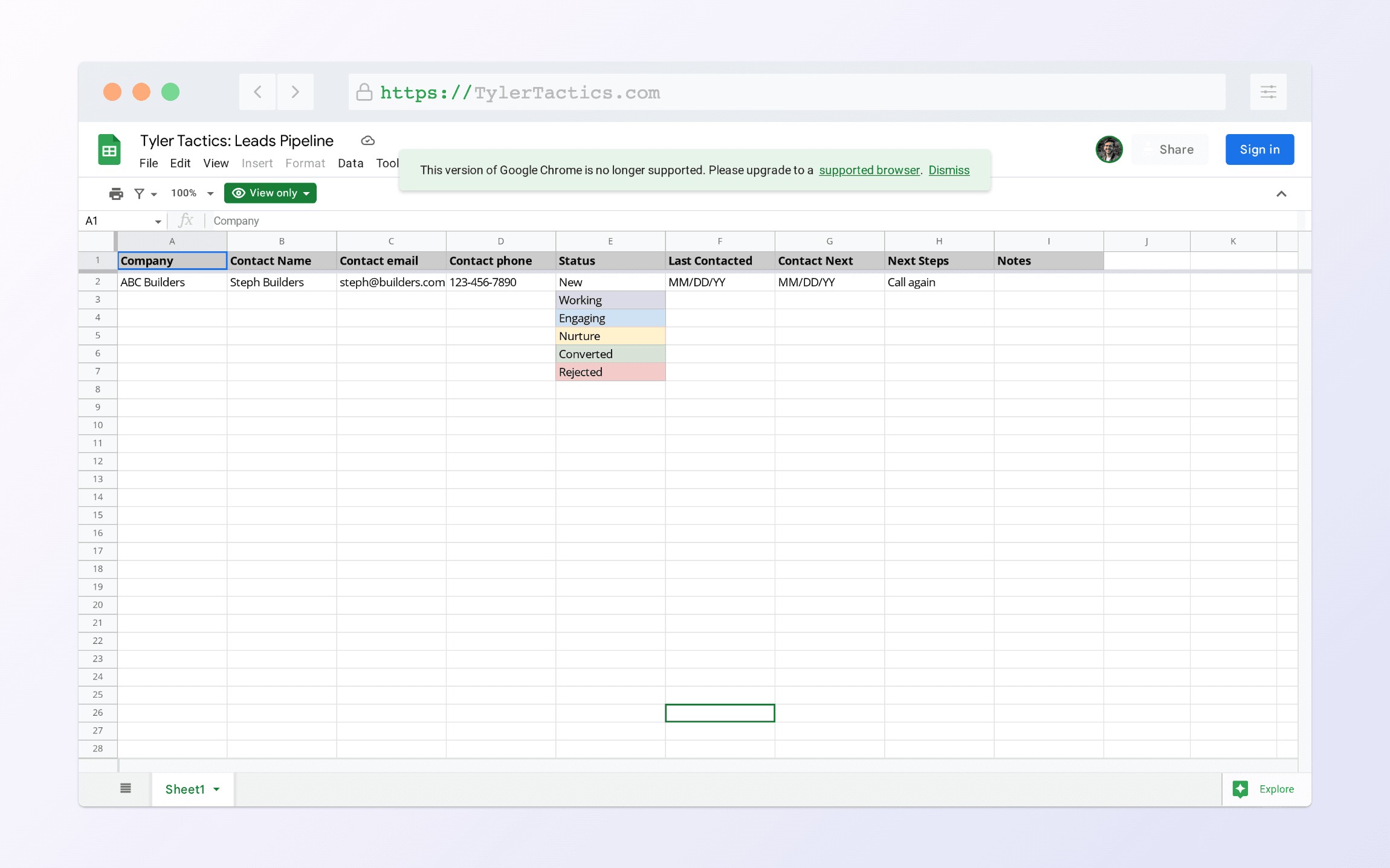 We’re basically going to create our own quick & simple CRM using a rusty and trusty spreadsheet. We want to be able to track contact information, status, and steps so that we can easily build a pipeline of leads that can be converted into opportunities.