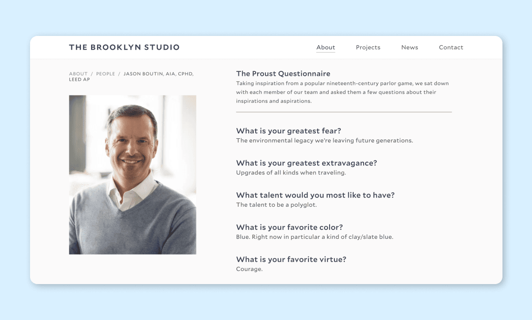 Team visibility: Showcasing the firm’s profiles on your website isn't just about putting faces to names; it's about telling their stories. The Brooklyn Studio does this really well. They not only give bios for their team but they also include a fun Q&A with each employee to show their personalities! Think about how much easier it is for prospective clients to feel connected to their team - the impact is awesome.