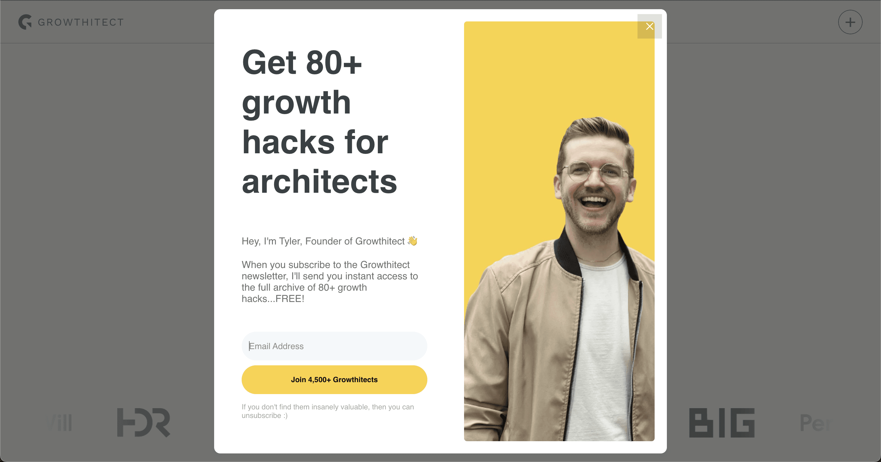 For example, you can see my exit-intent popup on Growthitect below. It’s not really well designed, but the value prop is clear and it’s currently converting at around 7% (anything between 2-10% is generally high-performing).